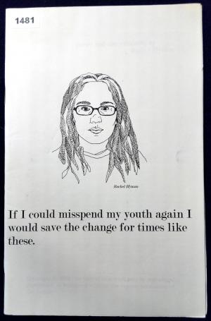 Performance Name: Near Misses Poet: Rachel Hyman Object Record: If I Could Misspend Youth Again I would Save the Change for Times Like These Track/Page:10Performance Date:Venue: Media File: Tags: